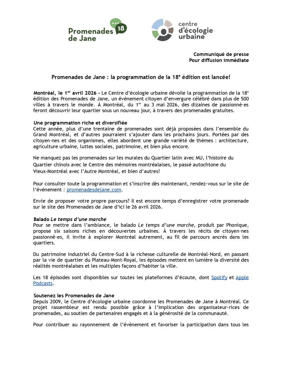 3 mars 2026 - Les Promenades de Jane reviennent pour une 18ᵉ édition à Montréal